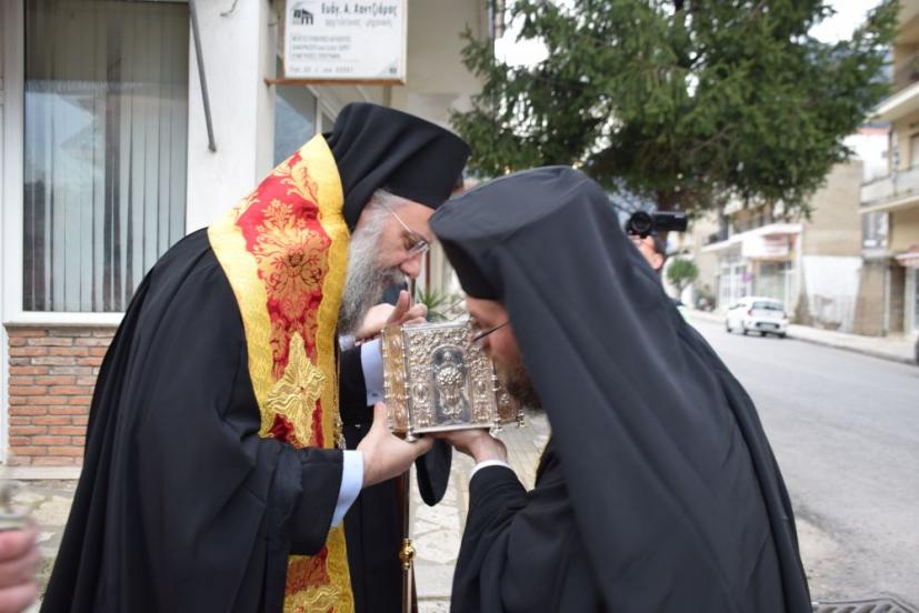 Με τη δέουσα θρησκευτική κατάνυξη και μεγαλοπρέπεια υποδέχθηκε έμπροσθεν του Ιερού Ναού Αγίου Βησσαρίωνος Πύλης Τρικάλων την Τιμία Κάρα ο Σεβασμιώτατος Μητροπολίτης Τρίκκης, Γαρδικίου και Πύλης κ. Χρυσόστομος και εν συνεχεία τοποθετήθηκε εντός του Ιερού Ναού.
