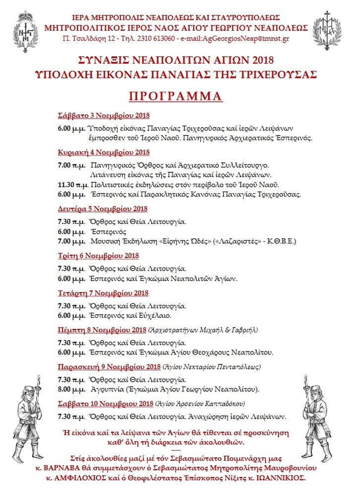 Την Κυριακή 4 Νοεμβρίου 2018 (7.30 π.μ.) θα τελεστεί Αρχιερατικό Συλλείτουργο και εν συνεχεία θα πραγματοποιηθεί η καθιερωμένη Λιτάνευση της εικόνας της Παναγίας και των ιερών Λειψάνων στους κεντρικούς δρόμους της Νεάπολης. Θα ακολουθήσουν πολιτιστικές εκδηλώσεις με παραδοσιακά σχήματα.