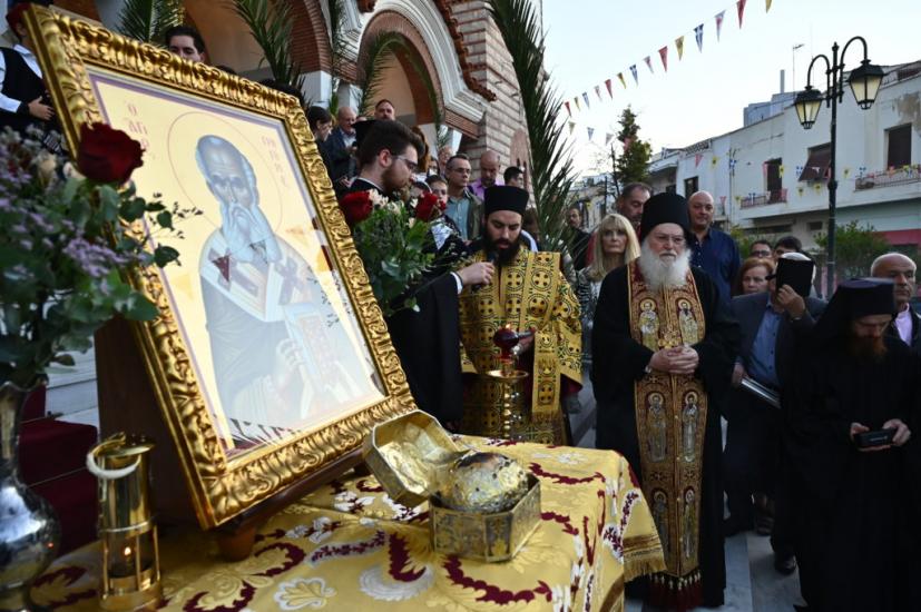 Το ιερό Λείψανο κόμισε στον Ιερό Ναό Αγίου Δημητρίου δήμου Αγίου Δημητρίου ο Καθηγούμενος της Ιεράς Μεγίστης Μονής Βατοπαιδίου, Πανοσιολογιώτατος Αρχιμανδρίτης Γέροντας Εφραίμ.