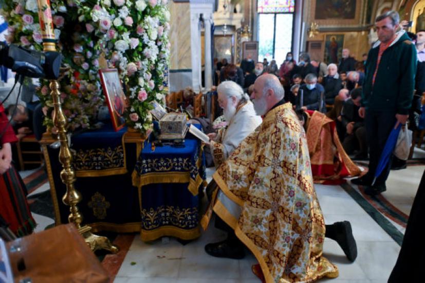 Την Θεία Λειτουργία τέλεσε ο Καθηγούμενος της Ιεράς Μεγίστης Μονής Βατοπαιδίου Αρχιμανδρίτης Εφραίμ ο οποίος και προσεκόμισε την Τιμία Ζώνη από το Άγιον Όρος.