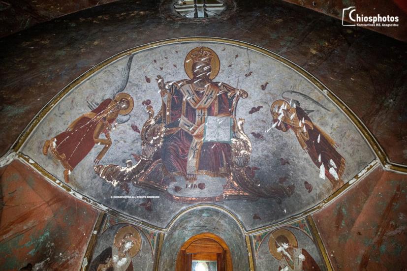 Τα τραγικά γεγονότα των Σφαγών της Χίου το 1822 έχουν αφήσει ανεξίτηλα τα σημάδια τους μέχρι και σήμερα στις τοιχογραφίες του ναού, στις οποίες οι φανατισμένοι Οθωμανοί ξέσπασαν την εκδικητική τους μανία. Τύφλωσαν τους αγίους αφαιρώντας τους τα μάτια με ξιφολόγχες και χάραξαν τα σώματά τους με σπάθες. Ο σημερινός επισκέπτης μπορεί να δει με τα ίδια του τα μάτια το παραπάνω θέαμα.